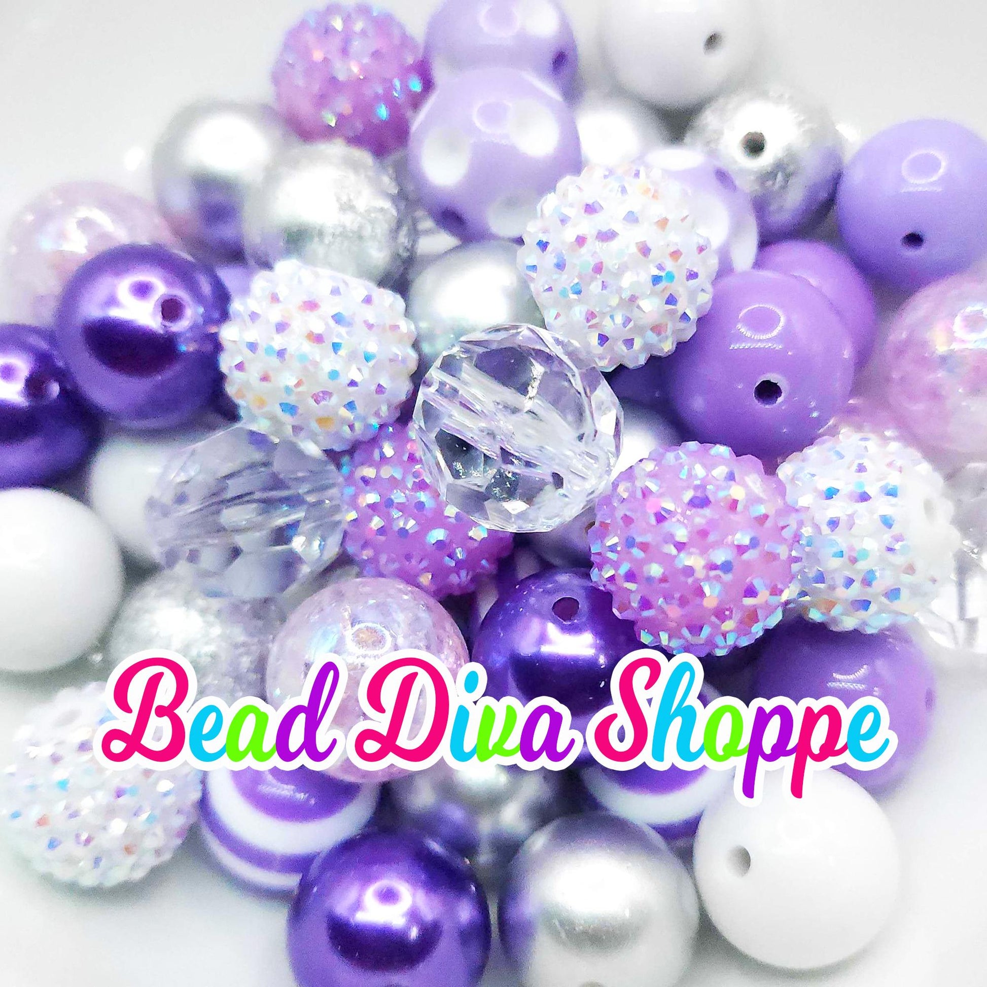 Set of 24 - 20mm - PURPLE / SILVER / WHITE - Bead Mix - Bubblegum - Round Acrylic Beads for Diy and Jewelry Making Supplies