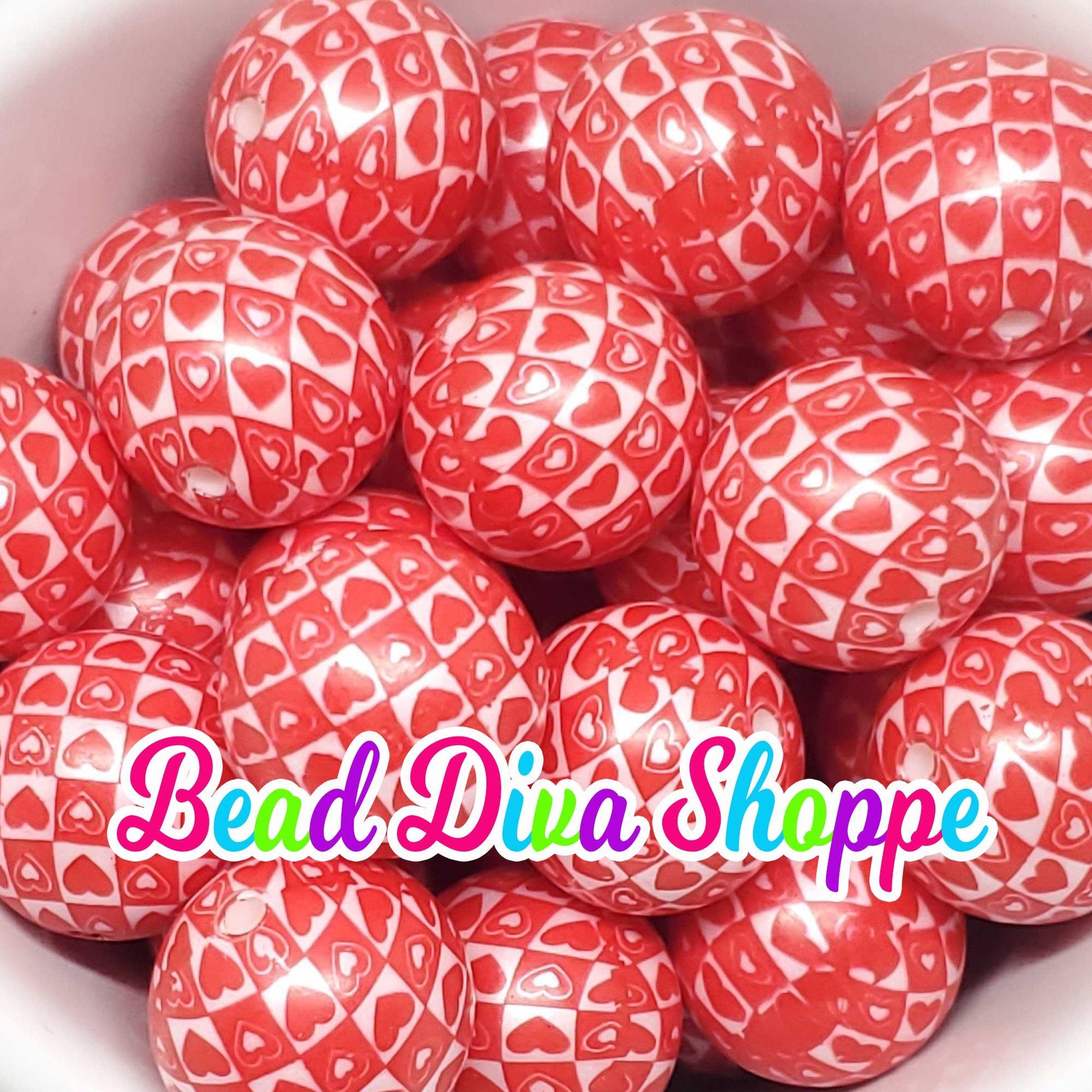 20mm - RED HEART Checkered Print Beads - Bubblegum - Round Acrylic Beads for Diy and Jewelry Making Supplies