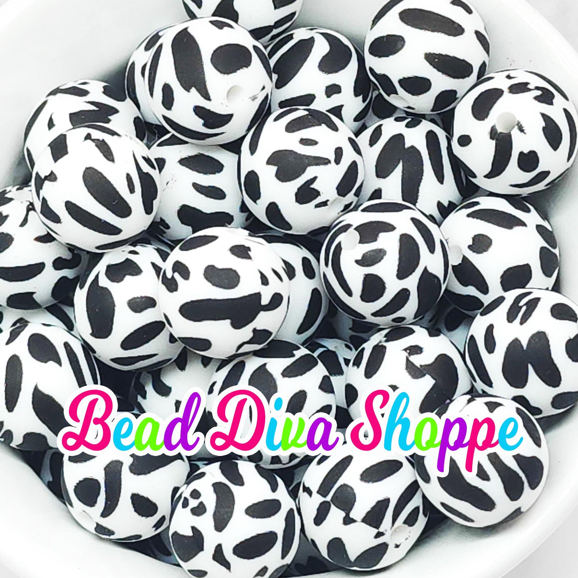Set of 10 - 15mm - BLACK White COW PRINT - Round Silicone Beads for Diy and Jewelry Making Supplies