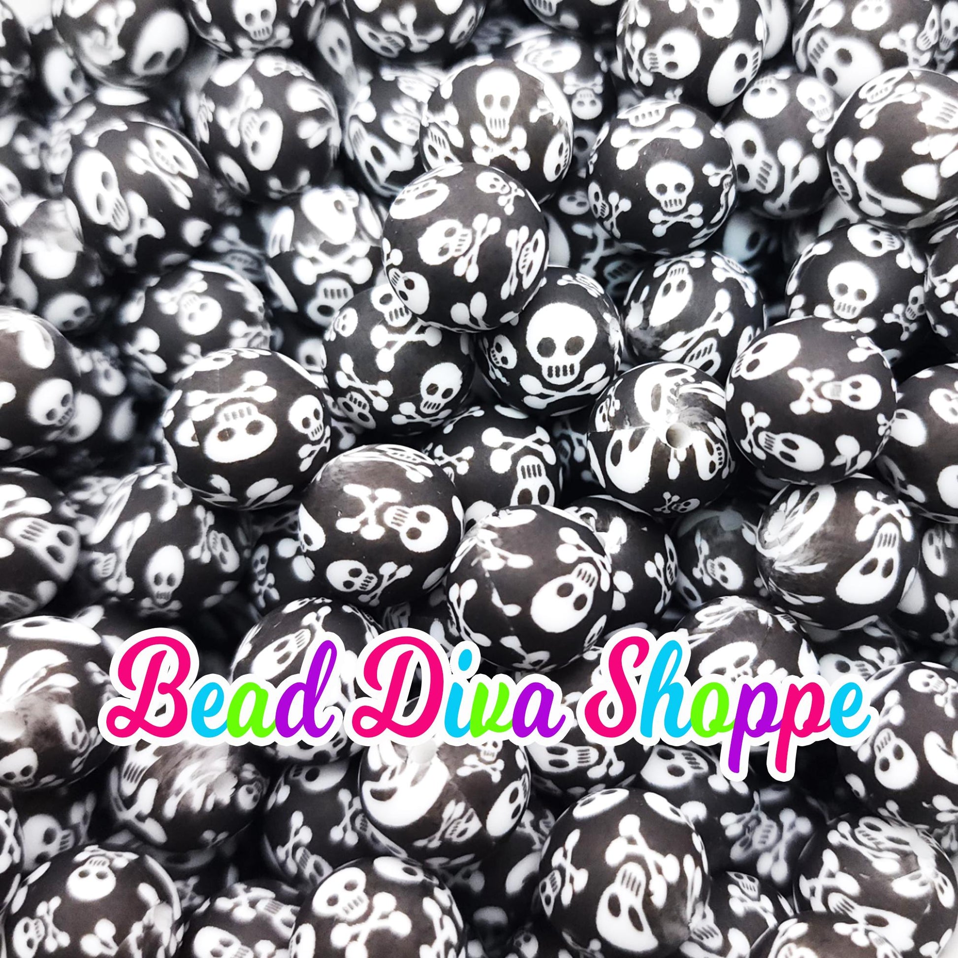 Set of 10 - 15mm - BLACK / WHITE SKULLS - Round Silicone Beads for Diy and Jewelry Making Supplies