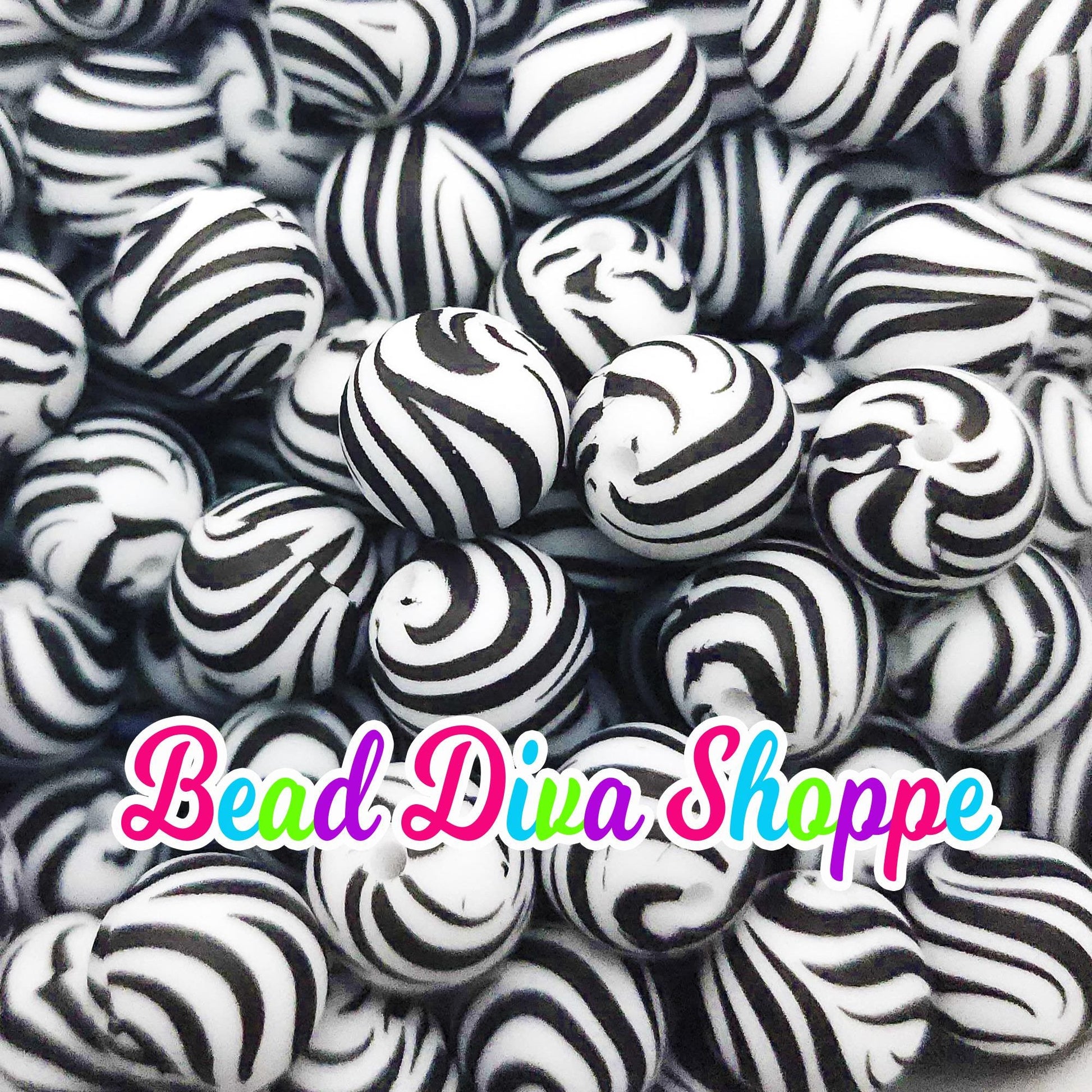 Set of 10 - 15mm - BLACK/WHITE ZEBRA - Round Silicone Beads - Diy Jewelry Making - Beaded Pens - Keychains - Bracelets