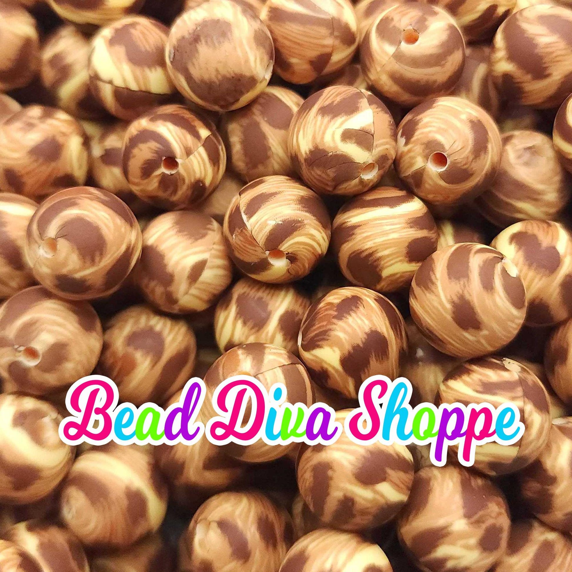 Set of 10 - 15mm - BROWN/TAN CHEETAH Print - Round Silicone Beads for Diy and Jewelry Making Supplies