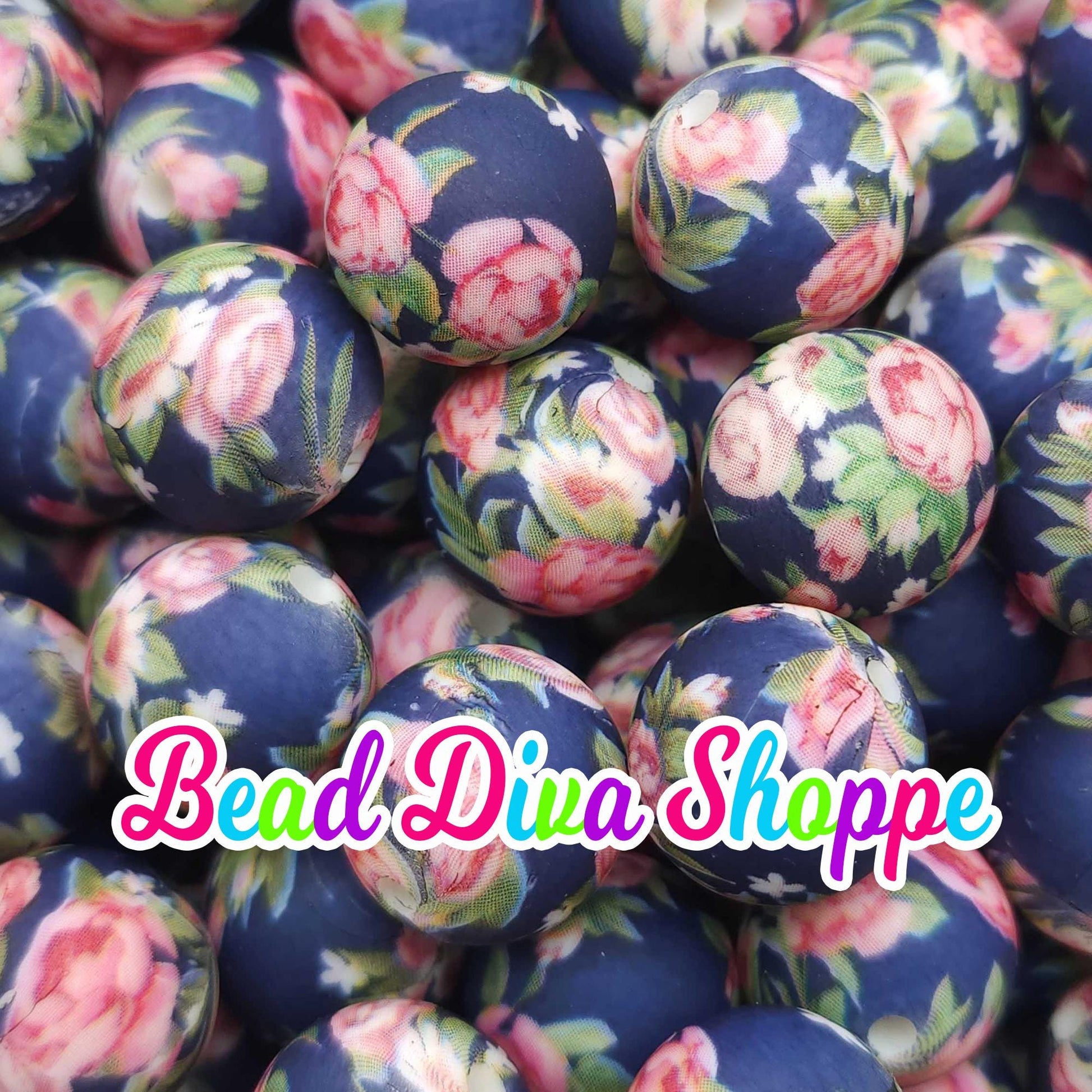 Set of 10 - 15mm - SHABBY BLUE FLORAL - Round Silicone Beads for Diy and Jewelry Making Supplies - Keychains - Beaded Pens