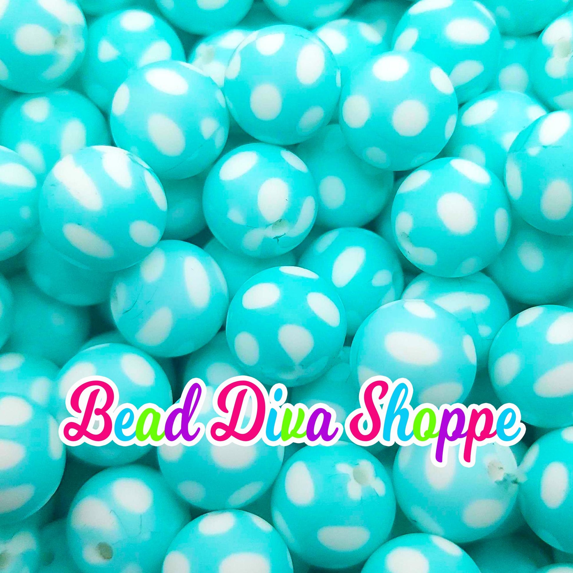 Set of 10 - 15mm - TURQUOISE / WHITE POLKADOTS - Round Silicone Beads - Diy Jewelry Making - Beaded Pens - Keychains - Bracelets